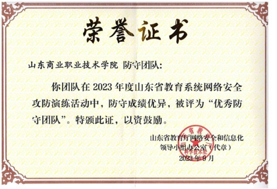 9月12日,2023年國家網(wǎng)絡(luò)安全宣傳周山東省校園日活動(dòng)啟動(dòng)儀式上對2023年度山東省教育系統(tǒng)網(wǎng)絡(luò)安全攻防演練表現(xiàn)突出的攻擊隊(duì)伍和優(yōu)秀防守單位進(jìn)行現(xiàn)場表彰,山東商職學(xué)院獲評“優(yōu)秀防守團(tuán)隊(duì)”。