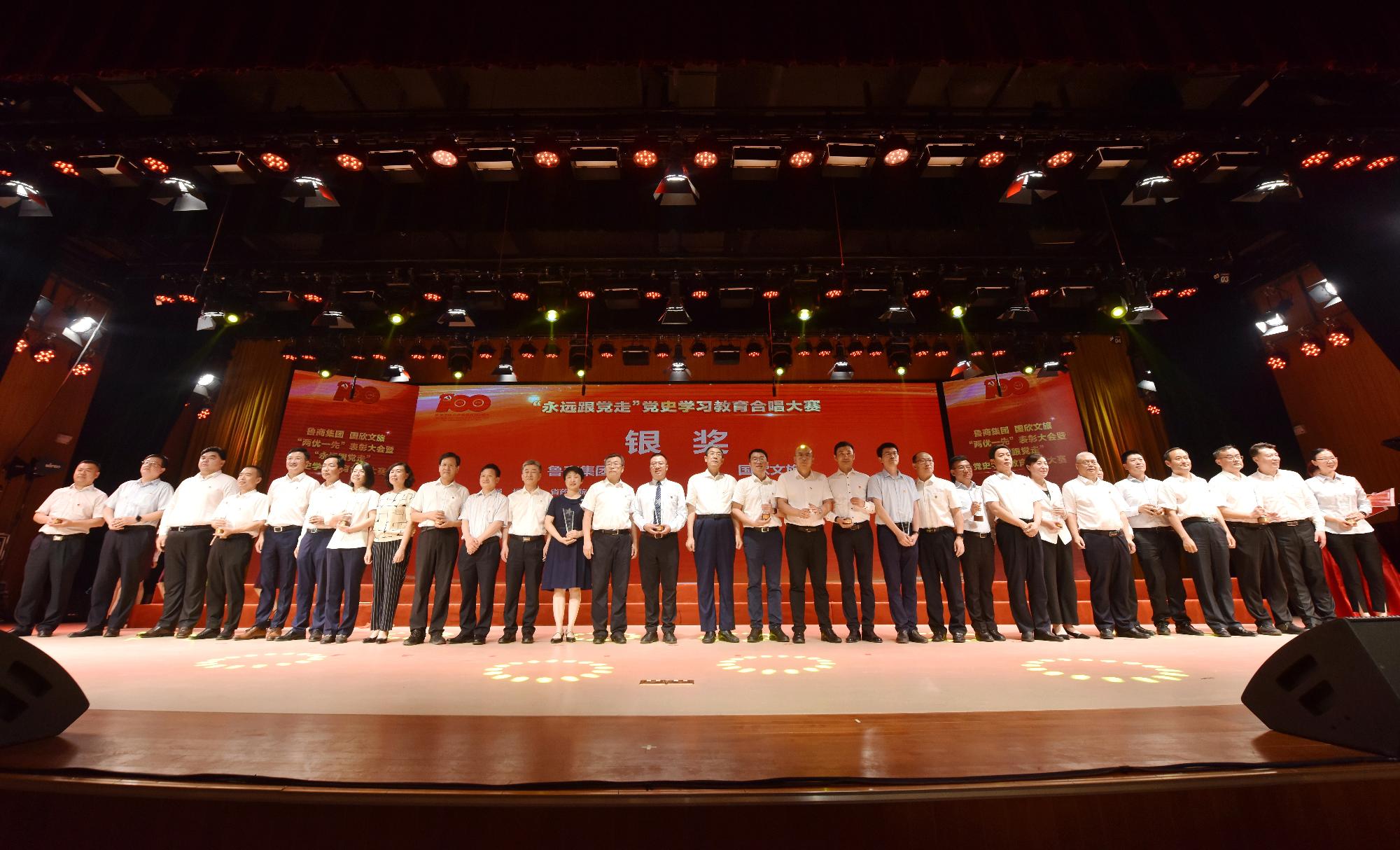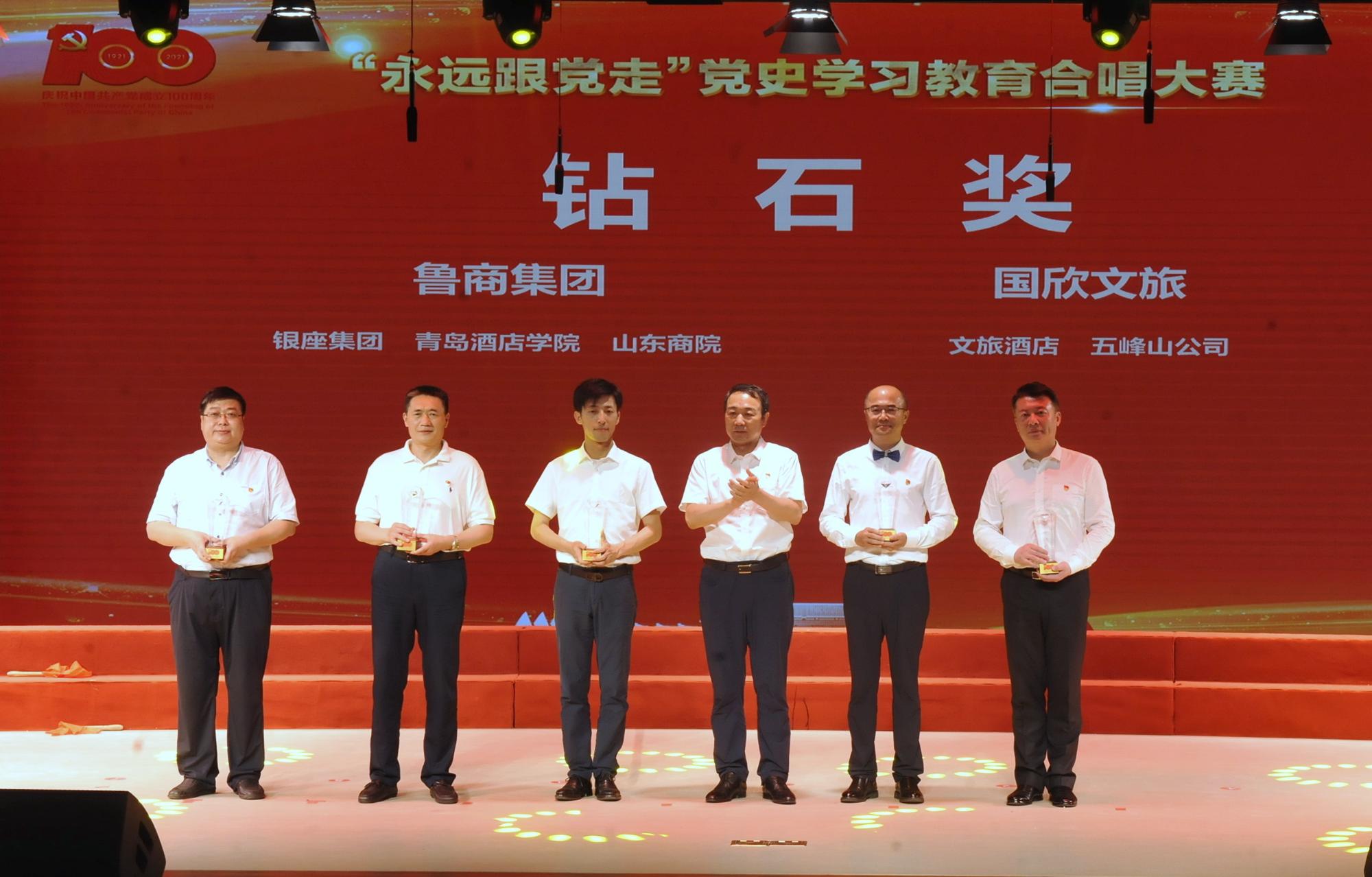 在隨后舉行的“永遠跟黨走”黨史學習教育合唱大賽總決賽環節,晉級決賽的9支參賽隊伍為現場觀眾帶來了一場精彩絕倫的視聽盛宴。經過激烈角逐,最終銀座集團、青島酒店學院、山東商院3個單位獲得“鉆石獎”,7個單位獲得“金獎”,13個單位獲得“銀獎”。魯商集團離退休中心獲得特殊貢獻獎。
